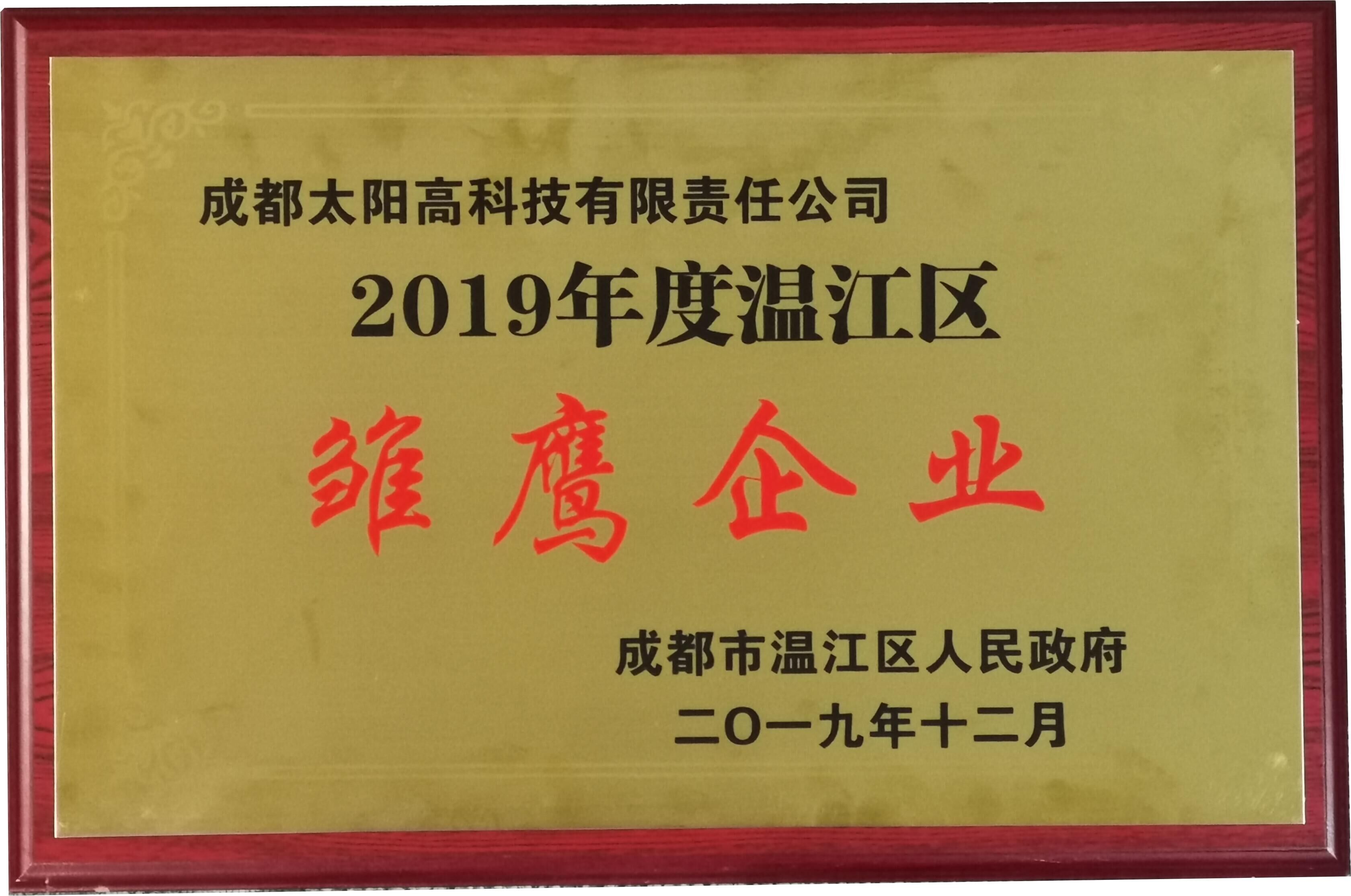 2019年12月26日,在成都市溫江區(qū)人民政府主辦的“創(chuàng)業(yè)天府·圓夢溫江”2020創(chuàng)享嘉年華晚會上,成都市溫江區(qū)人民政府對優(yōu)秀科技型企業(yè)進行表彰,川能水電集團太陽高科公司榮獲2019年度溫江區(qū)“雛鷹企業(yè)”榮譽稱號。