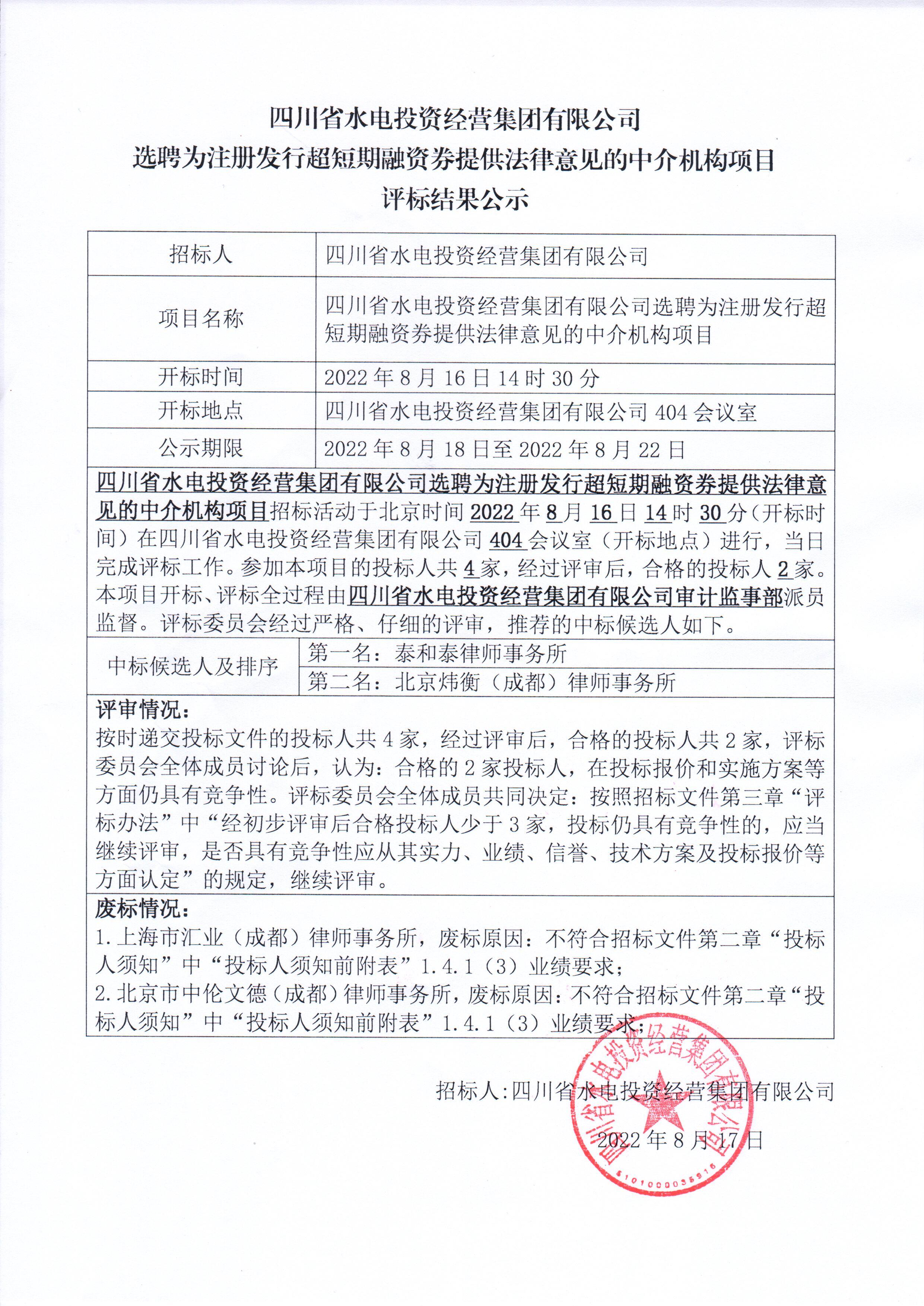 四川省水電投資經營集團有限公司選聘為注冊發行超短期融資券提供法律意見的中介機構項目評標結果公示