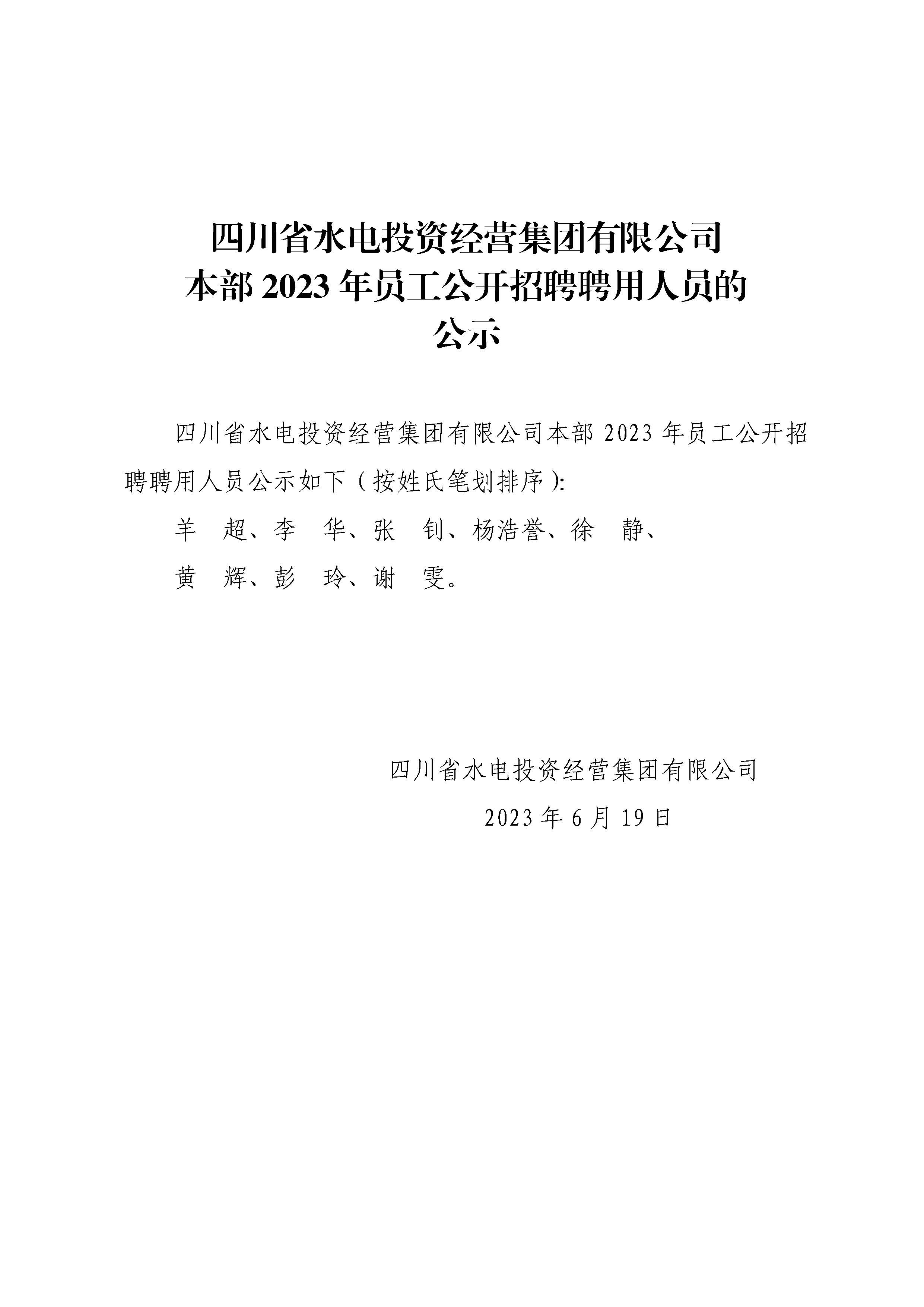 四川省水電投資經營集團有限公司本部2023年員工公開招聘聘用人員的公示